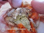 4.内子・味噌・・・そのまま食べます。前かけ(フンドシ)を取り除いた奥の部分や甲羅についた口の部分を押して取ると隠れた内子があります。